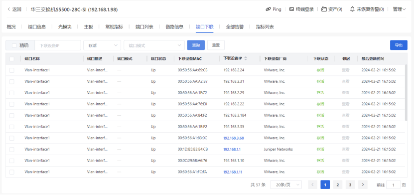 The port downlink feature for network device management displays which devices are directly or indirectly connected to network ports by combining information from the network device’s LLDP neighbor table, ARP table, and Mac table. Displayed information includes port name, port description, port mode, port status, downlink device Mac, downlink device IP, downlink device manufacturer, downlink status, and neighbors.