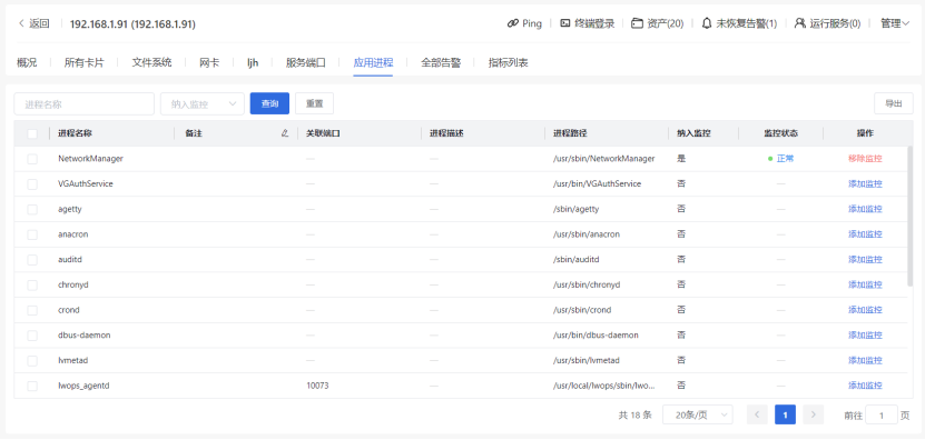 New application process monitoring supports individual monitoring of application processes and service ports on operating systems, automatically triggering alerts when certain processes disconnect.