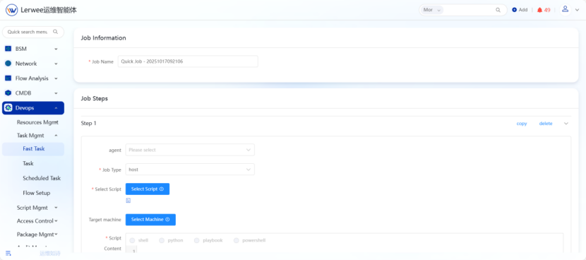 The Lerwee Automation O&M platform provides three major functional modules: quick jobs, my jobs, and scheduled jobs. It supports multi-step job orchestration and long-term storage to meet the diverse needs of daily O&M jobs. The scheduled job function can customize the task execution time to realize the automatic execution of periodic job tasks, greatly improving O&M efficiency.