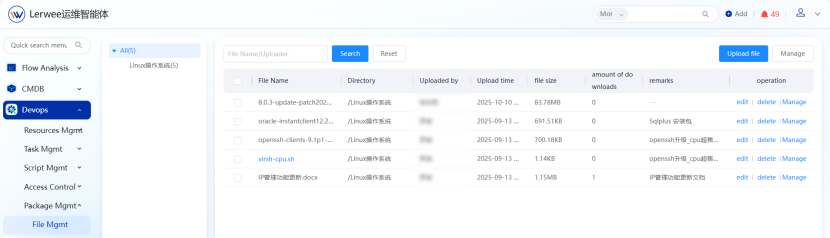 The platform integrates file management, file distribution, and file backup functions. It supports operations such as batch upload, hierarchical directory tree viewing, batch deletion, and download, realizing the full life cycle management of files. The file distribution function can quickly distribute software packages to target hosts in batches and supports proxy distribution mode to ensure the smooth completion of distribution tasks. The file backup function provides backup support for various types of files, can set storage duration, and supports online preview, download, and text comparison operations to protect data security.