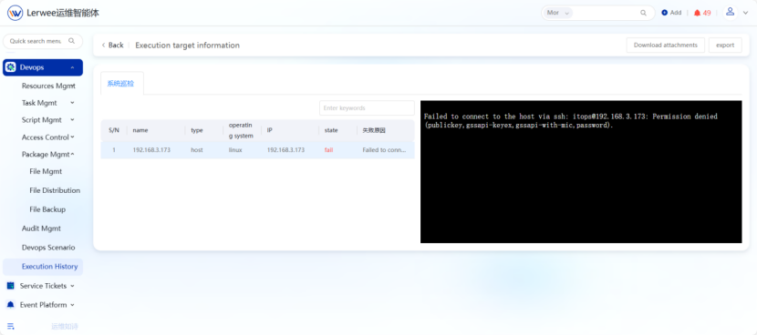 The Lerwee Automation O&M platform records in detail the historical information of all O&M jobs, script execution, fault self-healing, and file distribution. It supports exporting execution content to Word documents and attachment downloads, providing strong data support for O&M work reports.