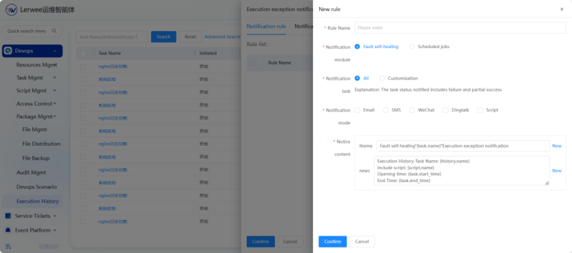 At the same time, the platform provides an exception notification function. When fault self-healing or scheduled task execution fails, it sends notifications to the person in charge in a timely manner to ensure that the task can quickly resume normal execution.