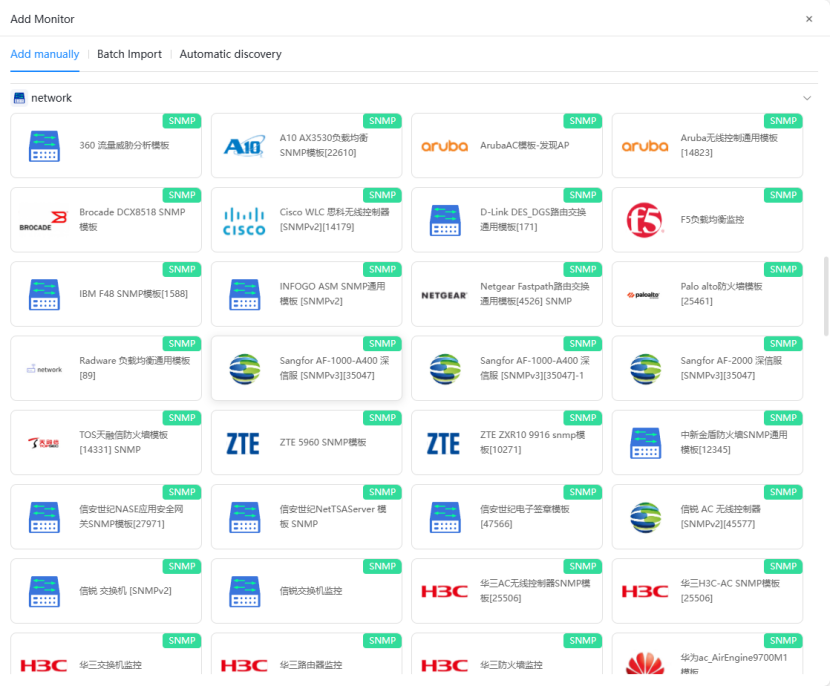 - Intelligent One-Click Discovery Capability: It adopts a lightweight one-click discovery mechanism. Operation and maintenance personnel only need to input the target IP address segment and corresponding management credentials (such as SNMP protocol parameters, SSH accounts, etc.), and the system will automatically initiate the scanning process. Its core advantage lies in the compatibility with multiple types of devices. It can not only identify traditional network devices (firewalls, switches, routers) but also cover non-network nodes such as servers (Windows/Linux), storage devices, and IoT terminals. It is widely compatible with domestic and foreign manufacturers, including mainstream domestic brands like Huawei, H3C, and Sangfor, as well as international manufacturers such as Cisco, Juniper, and Fortinet. This meets the monitoring needs of hybrid IT environments.