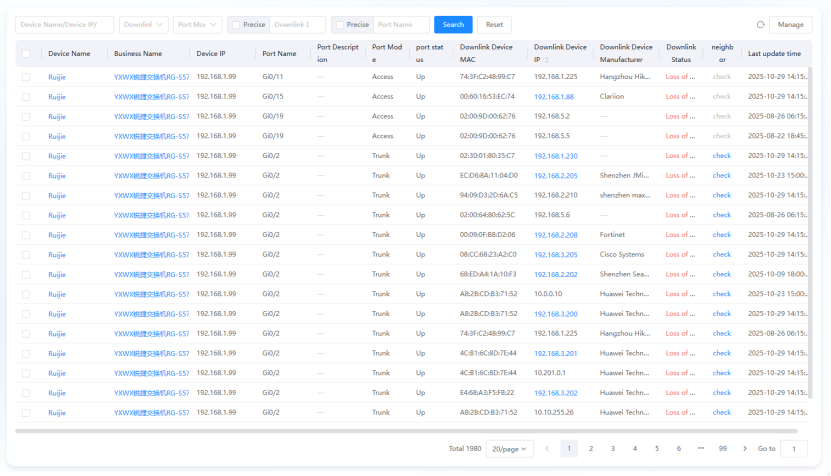 It focuses on the visualization of port downlink functions. On the device details page, it can directly display downlink device information for each network port, including key data such as the downlink device’s IP, MAC address, manufacturer model, and neighbor device name. It can even display the online status and interface traffic of the downlink device in real time. This refined display method allows operation and maintenance personnel to obtain core information without switching between multiple pages when troubleshooting issues such as “disconnection of a port’s downlink device” and “bandwidth bottlenecks of a specific link”, significantly improving fault location efficiency.