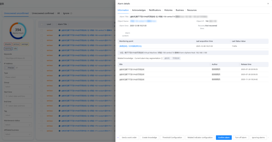 In addition, the platform is equipped with a built-in expert knowledge base, allowing O&M staff to record fault handling methods in the system. Through algorithm-based automatic matching, these experiences are linked to the alarm list, providing reference for handling similar alarms in the future. The knowledge base supports like and dislike functions, and the matching algorithm is continuously optimized based on user feedback to improve the accuracy of experience matching. This helps O&M personnel quickly locate faults, formulate solutions, and ensure the long-term stable operation of business systems.