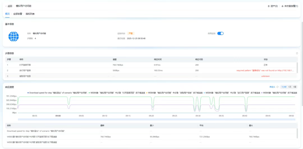 Lerwee closely aligns with the actual operational and maintenance scenarios of enterprises, establishing a comprehensive detection system that covers core aspects such as Web services, network connectivity, and route tracing. This system enables seamless monitoring from the basic network layer to upper-level business operations, accurately responding to core operational and maintenance needs. 01 Web Service Deep Monitoring: As the core entry point for enterprise digital interaction, the stability and response speed of Web services directly impact user experience. Lerwee Monitoring provides refined detection capabilities for Web scenarios. It not only collects core metrics such as response time, response code, service status, and response speed of URL addresses in real time but also achieves deep expansion of multi-step monitoring—simulating user logins, user queries, and other business operations to restore end-to-end experience monitoring in real business scenarios, accurately meeting the core operational and maintenance needs of enterprises for “business availability + user experience + precise fault localization”.
