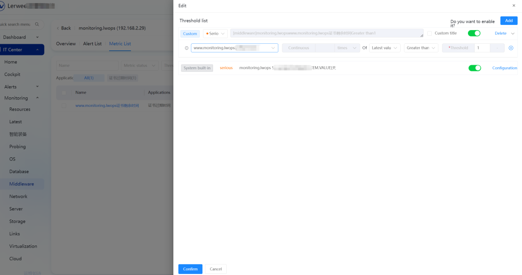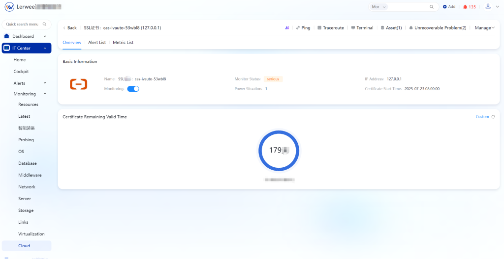 For SSL certificate management, Lerwee Monitoring offers a mature monitoring and automation solution that enables a complete closed loop from risk prediction to automatic resolution. SSL Certificate Monitoring: Achieve SSL certificate monitoring via automatic discovery or manual addition, with support for viewing various metrics such as the remaining valid time and certificate type of each certificate.