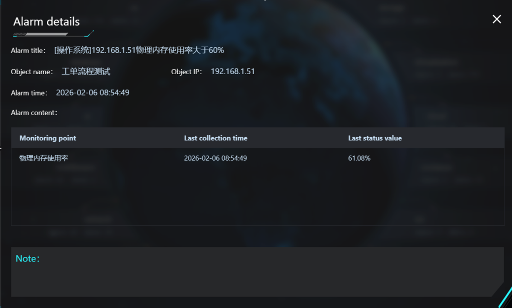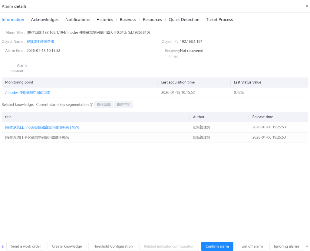 Click on the title to view alert details (basic information, confirmation status, alert notifications/history, impact scope, asset information).