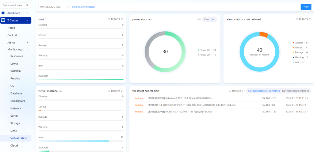 Virtualization monitoring, alert statistics for physical hosts and virtual machines, power status (on/off) statistics, unresolved alert statistics, and the latest critical alerts.