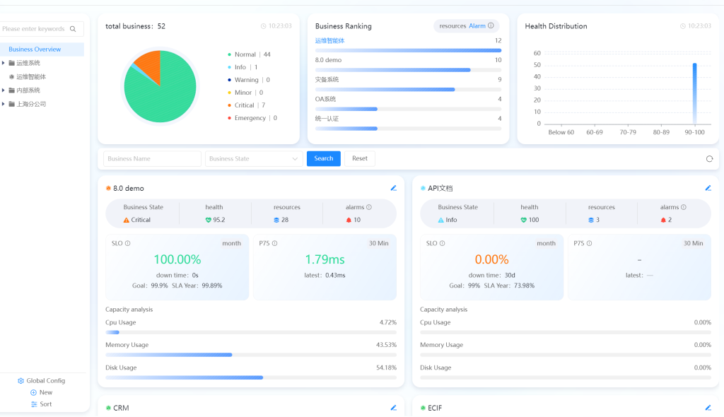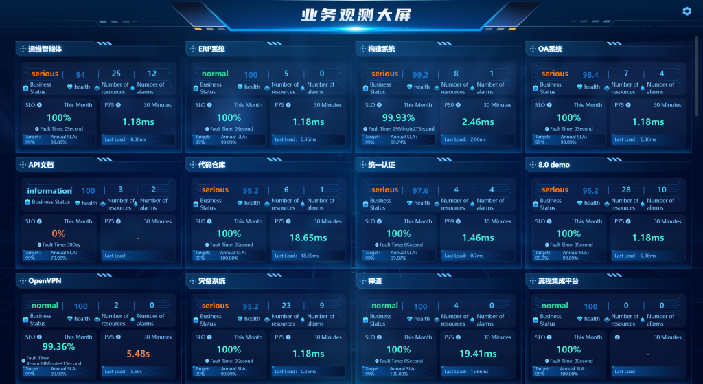 Equipped with exclusive display modules for business architectures (e.g., OA systems, ERP systems, code repositories, disaster recovery systems, etc.). It identifies business status (normal/abnormal) and presents health scores, resource/alert counts, SLO (Service Level Objective) achievement status for business services, P75 load metrics and more.