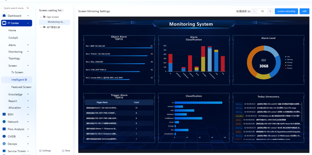Based on the network, business and virtualization topology systems, and combined with alert visualization capabilities, it builds a full-process fault handling link of Alert Perception – Topology Positioning – Root Cause Tracing. Relying on multi-level visualization and intelligent management capabilities, it greatly improves the efficiency of fault response and handling.