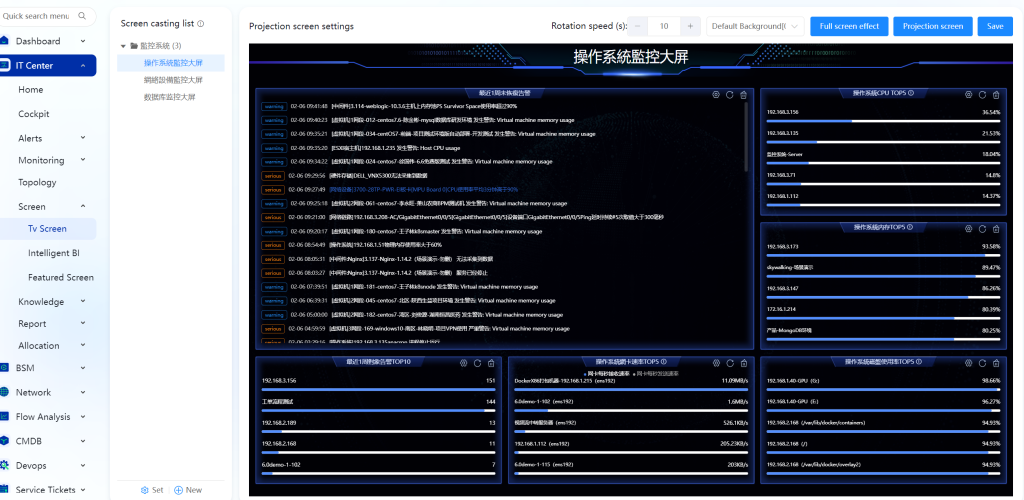 Core metrics including resource overview, alert summary, system load, top 10 alert objects and top 10 CPU/memory utilization rates are visualized in one screen for a panoramic view of the overall O&M status, ready to use out of the box.